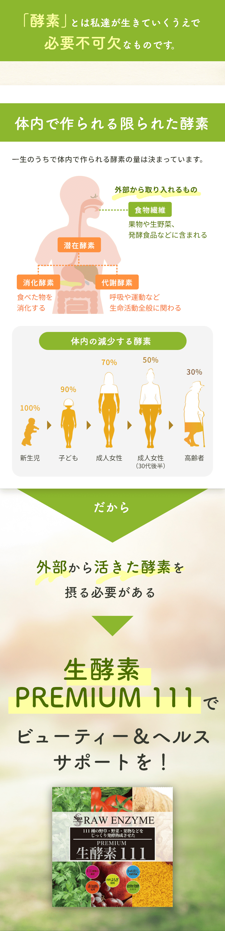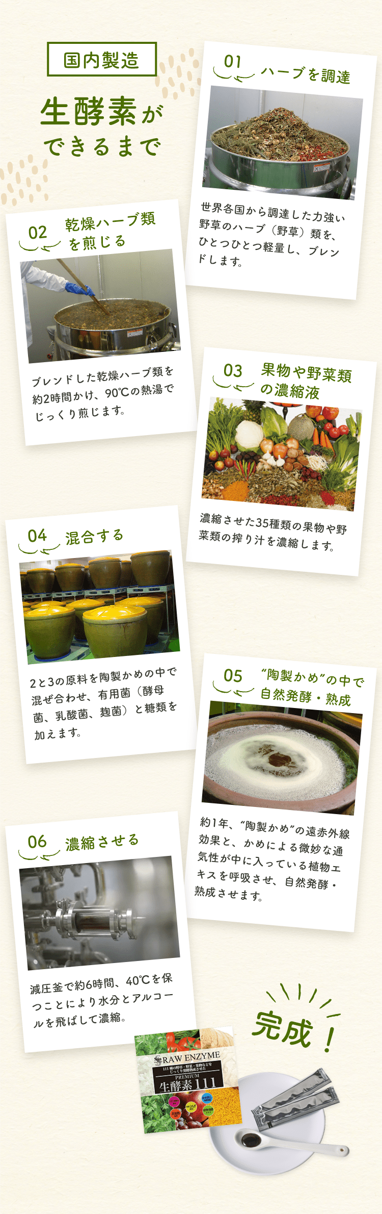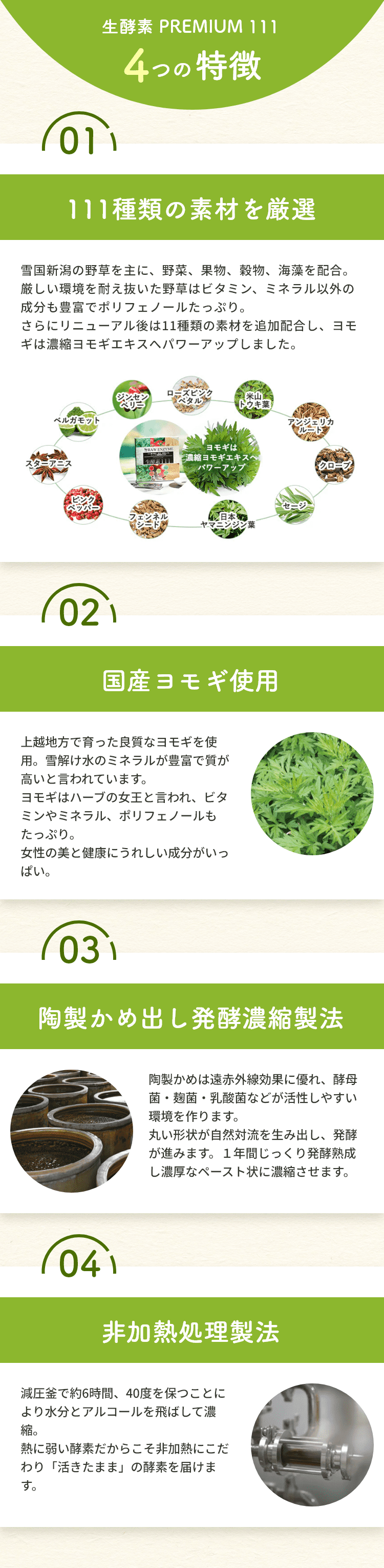 植物発酵エキス(糖類(てんさい糖蜜(国内製造)、黒砂糖、オリゴ糖)、野草類(ヨモギ、ウコン、ドクダミ、ハスの葉、高麗人参、センシンレン、オトギリソウ、クマザサ、タンポポの根、霊芝、アマチャヅル、トチュウ葉、オオバコ、カンゾウ、マツ葉、ナンテンの葉、アマドコロ、ツユ草、ツルナ、マカ、トンカットアリ、ハブソウ、ハト麦、スギナ、ビワ葉、ラカンカ、クコの実、レンセンソウ、モモの葉、イチョウ葉、ニンドウ、イチジクの葉、ベニバナ、エゾウコギ、エンメイソウ、モロヘイヤ、セッコツボク、アカメガシワ、クコ葉、カキの葉、カミツレ、カリン、シソ葉、桑葉、メグスリの木、田七人参、キキョウ根、ナツメ、サラシア、マタタビ、エビス草の種子、紅参、アガリクス、ルイボス、アムラの実、キャッツクロー、ローズヒップ、ガジュツ(紫ウコン)、セロリシード、バジル、月桂樹、ディル、ローズマリー、キャッサバ、ルッコラ、ローズピンクペダル、米山トウキ葉、アンジェリカルート、クローブ、セージ、日本ヤマニンジン葉、フェンネルシード、ピンクペッパー、スターアニス)果物類(ウメ、キンカン、イチジク、ミカン、パインアップル、リンゴ、グレープ、メロン、レモン、グレープフルーツ、アンズ、オールスパイス果実、ベルガモット、ジンセンベリー)野菜類(トウガラシ、ショウガ、シイタケ、ニンジン、タマネギ、タマネギ外皮、パセリ、キャベツ、ゴボウ、モヤシ、ニンニク、トマト、ネギ、ミズナ、コマツナ、コスレタス、ホウレン草、レッドマスタード、レッドビート、ターサイ、エンダイブ)、海藻類(コンブ、フノリ)、ヨモギ濃縮エキス、穀物発酵エキス(小麦を含む)、マルトデキストリン