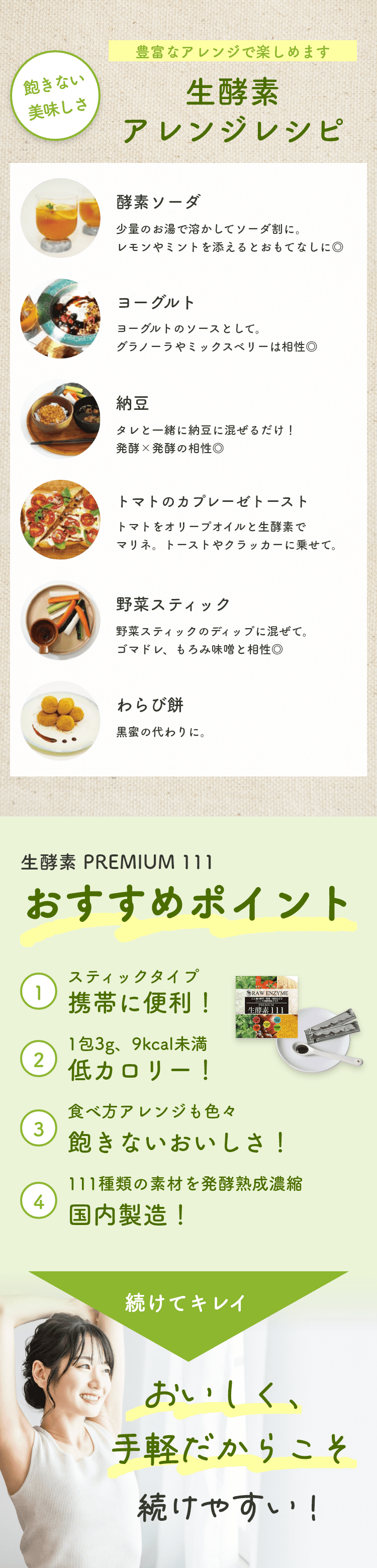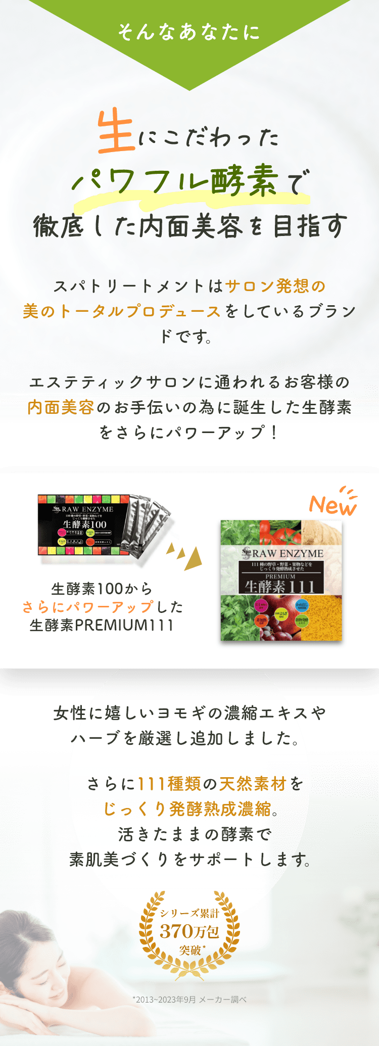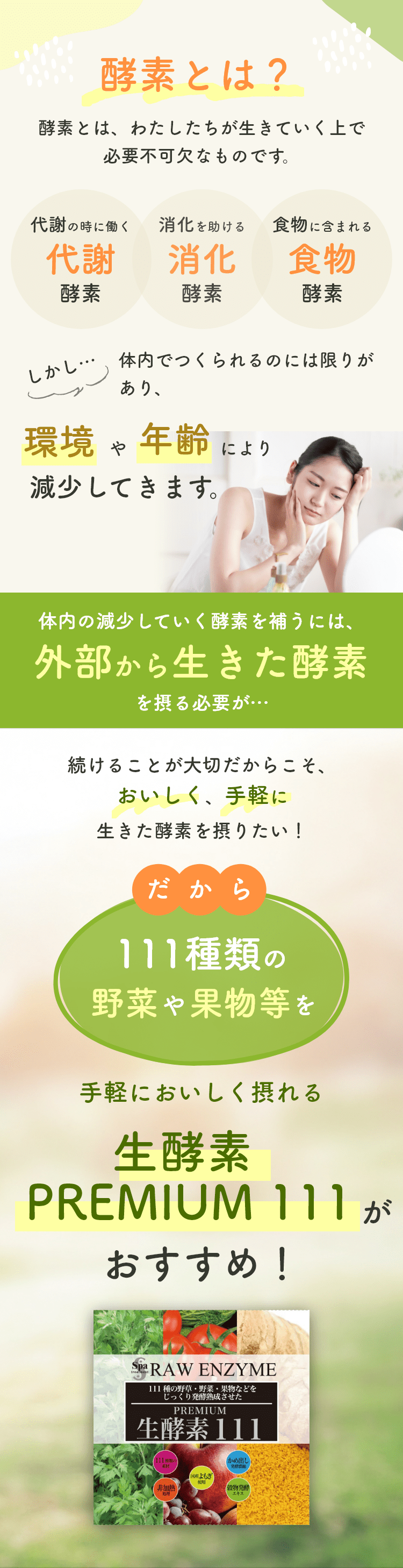 植物発酵エキス(糖類(てんさい糖蜜(国内製造)、黒砂糖、オリゴ糖)、野草類(ヨモギ、ウコン、ドクダミ、ハスの葉、高麗人参、センシンレン、オトギリソウ、クマザサ、タンポポの根、霊芝、アマチャヅル、トチュウ葉、オオバコ、カンゾウ、マツ葉、ナンテンの葉、アマドコロ、ツユ草、ツルナ、マカ、トンカットアリ、ハブソウ、ハト麦、スギナ、ビワ葉、ラカンカ、クコの実、レンセンソウ、モモの葉、イチョウ葉、ニンドウ、イチジクの葉、ベニバナ、エゾウコギ、エンメイソウ、モロヘイヤ、セッコツボク、アカメガシワ、クコ葉、カキの葉、カミツレ、カリン、シソ葉、桑葉、メグスリの木、田七人参、キキョウ根、ナツメ、サラシア、マタタビ、エビス草の種子、紅参、アガリクス、ルイボス、アムラの実、キャッツクロー、ローズヒップ、ガジュツ(紫ウコン)、セロリシード、バジル、月桂樹、ディル、ローズマリー、キャッサバ、ルッコラ、ローズピンクペダル、米山トウキ葉、アンジェリカルート、クローブ、セージ、日本ヤマニンジン葉、フェンネルシード、ピンクペッパー、スターアニス)果物類(ウメ、キンカン、イチジク、ミカン、パインアップル、リンゴ、グレープ、メロン、レモン、グレープフルーツ、アンズ、オールスパイス果実、ベルガモット、ジンセンベリー)野菜類(トウガラシ、ショウガ、シイタケ、ニンジン、タマネギ、タマネギ外皮、パセリ、キャベツ、ゴボウ、モヤシ、ニンニク、トマト、ネギ、ミズナ、コマツナ、コスレタス、ホウレン草、レッドマスタード、レッドビート、ターサイ、エンダイブ)、海藻類(コンブ、フノリ)、ヨモギ濃縮エキス、穀物発酵エキス(小麦を含む)、マルトデキストリン
